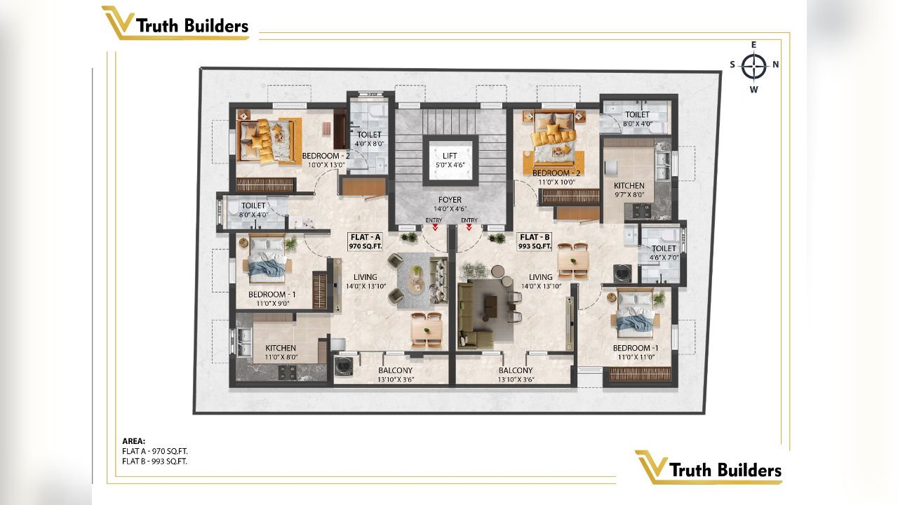 Second Floor: 970Sq.ft/993Sq.ft